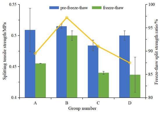 where TSR is the freeze–thaw splitting strength ratio, %; RT1 is the split tensile strength of the first group of specimens without freeze–thaw cycles, MPa, RT2 is the split tensile strength of the second group of specimens after the freeze–thaw cycle, MPa.