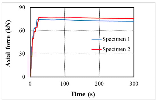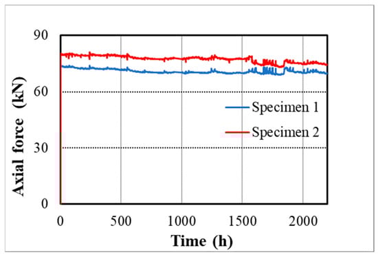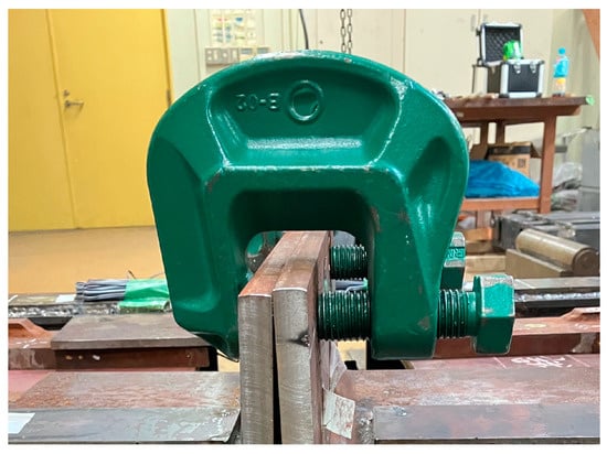 Figure A8 shows the load–displacement relationship in the direction of (b). The opening deformation of the vice is caused by a reaction from the axial force of the screw bolts introduced from a torque wrench. In the figure, the opening force remains elastic up to 200 kN. Thus, an allowable axial force of the bolt is set as 200 kN. This is shown by the solid red line in