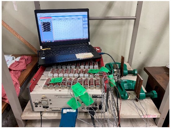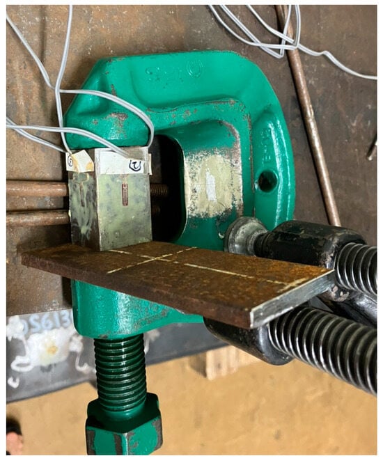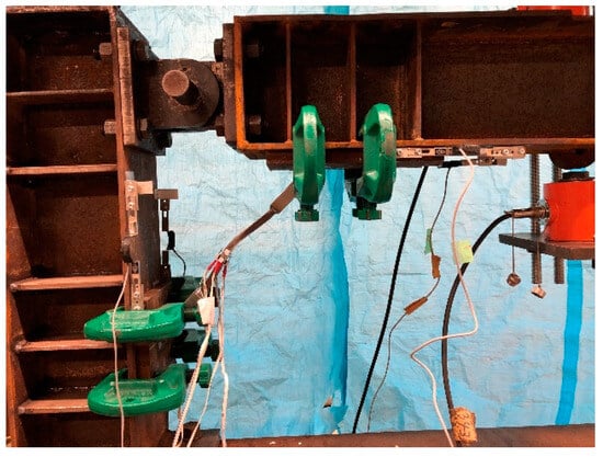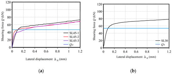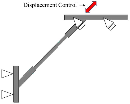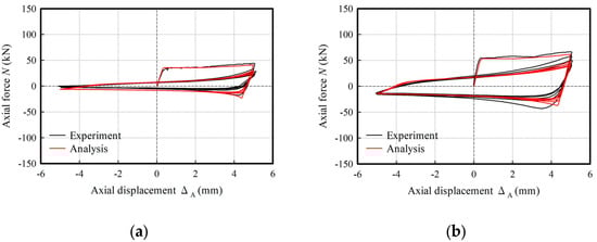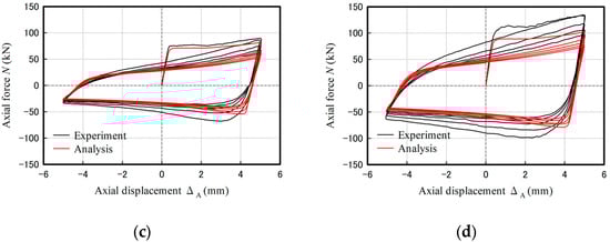 Figure A6 presents the load–displacement relationship in the direction of (a). In the figure, softening behavior is observed at approximately 30 kN; however, after that, the strength increases almost linearly up to 80 kN. After the steel plates joined by the vises start to slip, the bolt sustains a horizontal force. In this case, the main body of the vise, which provides twisting deformation, is subjected to the shearing force shown in