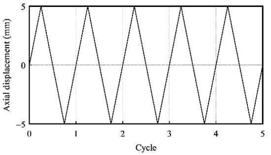 Figure A7 presents a contour diagram of von Mises stress at a displacement of 4 mm in case (a). In the figure, some parts of the vise are yielding; however, the stresses in most parts remain elastic. This indicates that no practical problems arise when using a vise for seismic retrofitting.