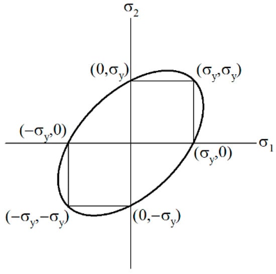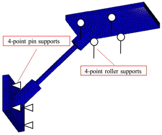 Figure A4, analytical supports are set at the top and bottom of the open part of the C shape of the vise. The four points at the bottom of the open part are fixed by pin supports. A horizontal sliding support is applied in the analysis of (a), and a vertical sliding support is applied in the analysis of (b). When the displacements are applied at the top of the vise, the reaction and relative displacements are obtained in each direction. The von Mises yield condition is used. The stress–strain model is defined as a bilinear elastoplastic model in