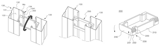 The developed stud, illustrated in Figure 5, features two small studs (130) with several separating clips (200, enlarged in 200) positioned opposite each other and separated by a specific width. The clip has grooves (220) on both sides so that it can be inserted into the metal stud lip (134, 1341) and assembled. This design reduces heat transfer through the studs because the metal component is not continuous. The separating clip is made of the plastic material, and it helps maintain the spacing between the studs and ensures structural stability. The clip has an asymmetrical curved shape (240, 231–232), which allows the clip to rotate in only one direction to prevent it from coming loose after assembly. Also, the size of the separating clip was designed to fit the standard size of the metal stud so that commercialized metal studs can be used for it.