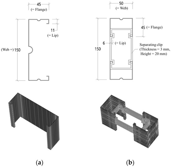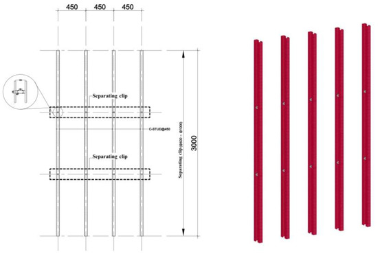 The conventional C-stud is shown in Figure 6a. The dimensions of the web-flange-lib are 150-45-11 mm, and the thickness is 0.8 mm. The length of the web (150 mm) was the same as the thickness of the glass wool insulation material (thermal conductivity = 0.034 W/mK). The web, which is the main path for heat conduction and penetrates the insulation material, should be separated to break the path for heat transfer.