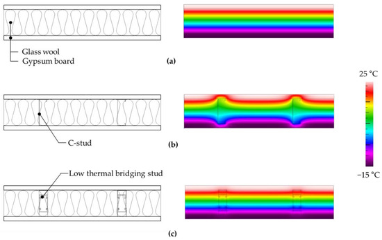 The evaluated models are as shown in Figure 7, and the boundary conditions of each side were 25 and −15 °C, respectively. The thermal conductivities of the insulation, gypsum board, and C-stud were 0.034, 0.18, and 63.0 W/mK, respectively. The thermal conductivity of the separating clip is 0.17 W/mK, as it made of plastic.