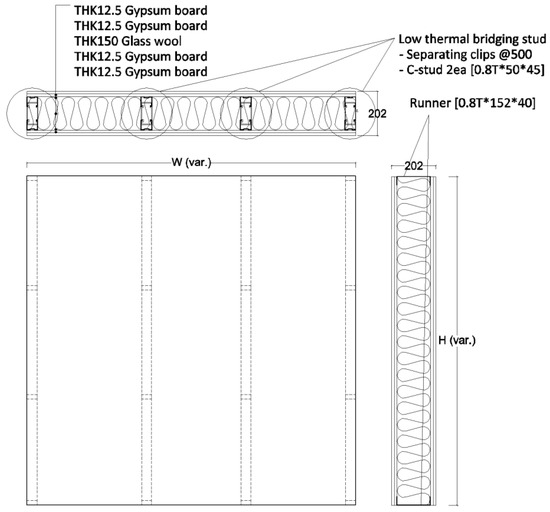 The drywall system must meet essential criteria for acoustic insulation, fire resistance, and structural and thermal insulation performance. For building applications, a mock-up test must be conducted according to the Korean standards for each performance attribute, as detailed in Table 6. The prototype wall is illustrated in Figure 10. Based on the structural analysis results from Section 3.3, the spacing of the separating clips was set at 750 mm. The width (W) and height (H) of the prototype were determined according to the type of mock-up test specified in Table 6.