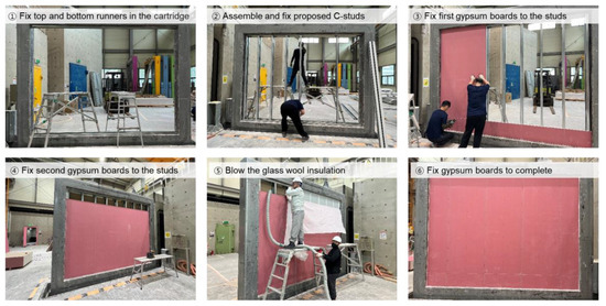 To separate the metal stud, two smaller C-studs with dimensions of 50-45-6 mm and thickness of 0.8 mm were used. The separating clip was used to maintain the space between the C-studs, as shown in Figure 6b. The studs and clips can be assembled in the field and factory before the installation. The construction is similar to that using the double studs but easier owing to the use of pre-assembled single stud and single runner. The separating clips were made of reinforced plastic, with height and thickness of 2 and 3 mm, respectively. Insulation materials cannot be fully filled in studs because of their narrow webs and bent flanges. Hence, a blowing-type insulation material was considered for filling the new C-stud with separating clips by using the hole at the center.