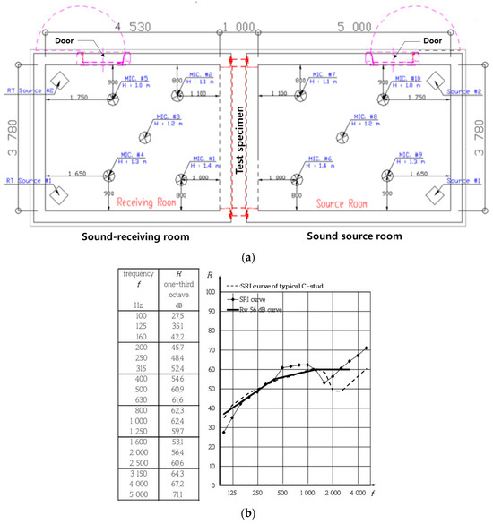 Acoustic insulation test facilities and test results: (a) plans for the test facility; (b) sound reduction index curve of the drywall system with the developed stud.