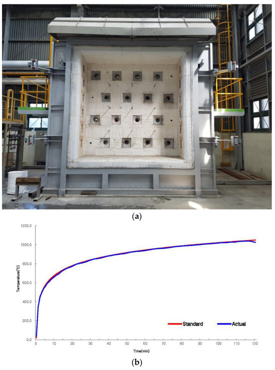 Test facility for fire resistance evaluation: (a) furnace in the test facility; (b) time–temperature curve of the furnace.