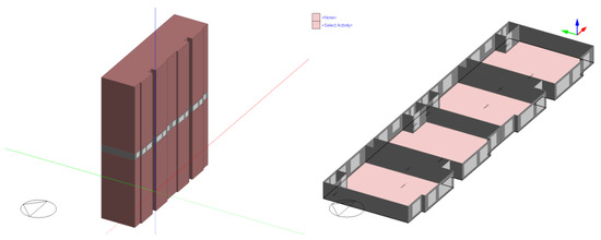 The building was modeled using DesignBuilder6.0 [17], which uses EnergyPlus24.1.0 [18] as the calculation engine. The image modeled in DesignBuilder based on Figure 17 is shown in Figure 18, and the input values for the simulation are shown in Table 10. To evaluate the effect of the wall load, the floor and ceiling surfaces were modeled as adiabatic surfaces. Balcony and E/V halls were modeled as semi-exterior unconditioned spaces.