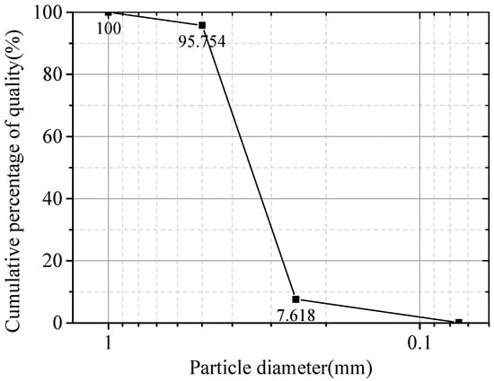 The fine-grained sandy soil was prepared by mixing sand with a specific amount of bentonite. In order to reduce the influence of other factors, a relatively uniform sand particle was used to prepare the sample. The sand had a non-uniformity coefficient (Cu) of 1.52 and a curvature coefficient (Cc) of 1.0. The distribution curve of the particle size of the sand is illustrated in Figure 1. In addition, the mineral content of bentonite is presented in Table 1. The prepared circular concrete block had a diameter of 61.8 mm and a thickness of 20 mm, and the strength grade of concrete was C30. The roughness of concrete blocks was analyzed through image analysis using Matlab (2023a), and the average peak valley distance on the surface of the concrete blocks was 0.1 mm.
