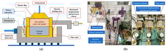 In this experiment, a self-improved temperature-controlled direct shear apparatus was employed as shown in Figure 2, and the accuracy of this equipment is 0.1 °C. This device was modified on the ZJ strain-controlled quadruple shear direct shear apparatus by an added temperature control system to acquire automatic heating and heat preservation. As illustrated in Figure 2a, sample heating is achieved by wrapping an electric heating wire around the outer surface of the copper shear box, while the fine sand filling the outside of the box is to achieve uniform heating and insulation. After connecting the power, the set temperature value is input on the temperature controller; then, the electric heating wire starts heating. When the temperature reaches the design value, the electric heating wire stops heating and enters the insulation state. At this time, the electric heating wire and fine sand ensure a constant temperature of the samples. The temperature range of the temperature control system is 20~70 °C. The physical image of the improved instrument is shown in Figure 2b.