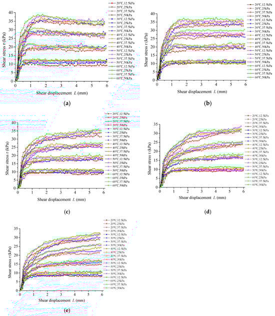 Before testing, the concrete block was wet and placed into the lower box of the shear box, ensuring that the shear surface of the shear box was exactly flush with the upper surface of the concrete block. Then, we continued to fill the box with the prepared soil samples. After the samples filled the box, the box was sealed with plastic film and a shear box cover, and then heated to the designated temperature and maintained for 90 min, which ensured the shear box and the soil sample evenly reached the designed temperature. The shear tests were carried out at a constant shear rate of 0.8 mm/min until the contact surface was destroyed and the ultimate shear strength was reached, or the shearing displacement reached 4 mm (ASTM D3080/D3080M-23 []). The test was stopped when the shearing displacement of the contact surface reached 6 mm. After the shear test, temperature detection was performed on the soil inside the shear box to ensure that the temperature remained constant throughout the entire shear process.