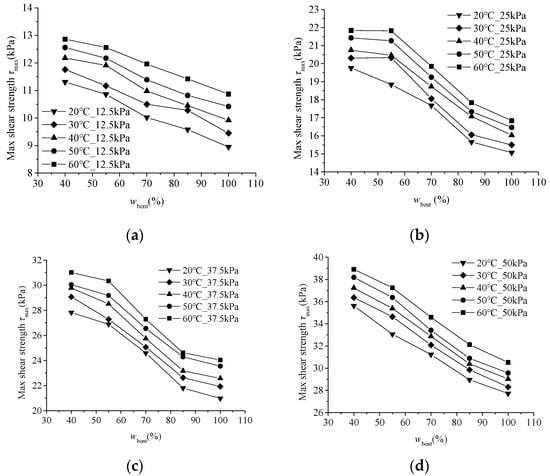 Figure 4 presents the max shear strength distribution of the soil–structure interface with different wbent, different temperatures and different normal stress values. It shows that the shear strength of the soil–structure interface decreased with the increase in wbent; this is consistent with the research of many scholars [,,,,,]. In addition, under consistent wbent and temperature, the reduction in the max shear strength gradually increased with the rise in normal stress. Thus, the decrease in the max shear strength by the wbent became more obvious as the normal stress increased. This result has also been confirmed before [,,,]. Furthermore, the max shear strength of the soil–structure interface exhibited a nearly linear increase with increase in temperature [].