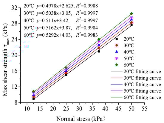 At the macro-level, temperature changes could cause the expansion and contraction of objects. In this experiment, as the temperature increased, the water molecules, sand particles, bentonite particles in the soil sample and even the concrete all experienced a certain degree of volume expansion [,,,]. Under the constraints of the shear box, the volume of the sample became denser. At this point, the positive stress on the shear surface between sand particles, bentonite particles and concrete increased, and the cohesion and friction angle between particles under shear load also increased, as shown in Figure 5, Figure 6 and Figure 7. This effect was similar to the increasing vertical load during specimen shearing, as shown in Figure 4 and Figure 5. Under the same conditions, the greater the normal stress, the greater the shear strength of the specimen.