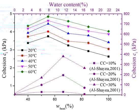 To further investigate the shear behavior of the soil–structure interface influenced by wbent, according to the relevant literature [,,], the Mohr–Coulomb failure criterion was employed to define the shear response. The relationship between the max shear strength (τmax) and corresponding normal stress was subjected to linear fitting to obtain the interface shear envelope, from which the cohesion (ci) and internal friction angle (φi) of the soil–structure interface could be acquired as shown in Figure 5. Figure 6 and Figure 7 represent the effect of temperature on cohesion (ci) and the internal friction angle (φi) of the soil–structure interface with different wbent, respectively.