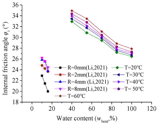 As illustrated in Figure 6, as the wbent increased, the cohesion of the soil–structure interface at each temperature initially increased and subsequently decreased, peaking at a wbent of 55%; other scholars have also observed such phenomena [,,]. Figure 7 demonstrated that the internal friction angle of the soil–structure interface decreased with the increase in the wbent at various temperatures. Such phenomena have also observed by Li et al. [] Moreover, an increased wbent led to a lower reduction in the friction angle of the soil–structure interface. Consequently, the influence of wbent on the angle of the soil–structure interface was more significant than that of temperature.