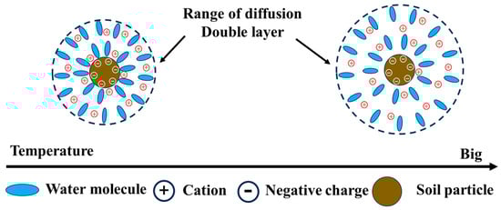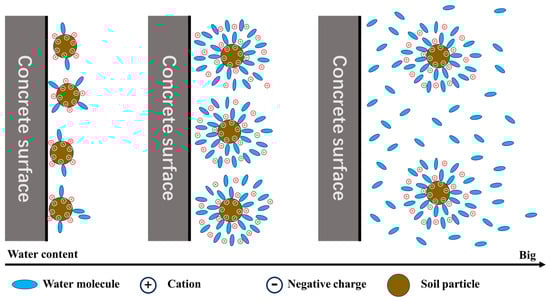 At the microscopic level, temperature can affect the activity state of molecules. In this experiment, as the temperature gradually increased, the energy and activity of water molecules and cations on the surface of the particles increased, and the activity range of water molecules and ions also increased. Therefore, the area of adsorbed water layer or DEL on the surface of the particles increased, as shown in Figure 9. When the wbent was low, an increase in temperature led to an increase in the DEL, which increased the cohesive effect between particles. In addition, the increase in volume induced by the DEL squeezed the activity space of the sand particles, which augmented the contact normal force on the sand particle–concrete interface, leading to a larger friction effect. The combination of these two effects ultimately led to an increase in both the cohesion and friction of the soil–structure interface.