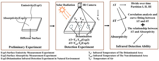 The research framework for this study is illustrated in Figure 1. First, the surface emissivity of yellow paint and white paint was obtained using the two-reference-body method, and the surface absorptivity of bare concrete, yellow paint, and white paint was derived based on the principle of energy conservation. After obtaining the surface properties, three artificial delaminated concrete specimens with different burial depths were designed. Each specimen had three delaminations, and delamination detection experiments were conducted under natural environmental conditions. The thermal contrast curve of delamination over the day was segmented into three phases based on its different trends better to understand the thermal contrast development of delamination over time. Additionally, a correlation analysis was conducted to reveal the influence of surface properties on detection at different phases. Finally, further correlation analysis and curve fitting were performed on the temperature difference between the non-delaminated regions, air (δT), and the corresponding thermal contrast (ΔT).