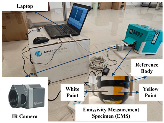 The accuracy of surface emissivity affects the accuracy of surface temperature measurements [38], which in turn will affect the thermal radiation and thermal imaging of the surface of the specimen. The emissivity of a material’s surface is a dimensionless quantity that characterizes the radiative capability of the material’s surface and is an essential thermal property parameter [39]. Based on previous studies [39,40], the emissivity of the surface of dry, normal concrete was set to 0.95 in this study. This study designed a measurement experiment to determine the emissivity of yellow and white paints, both of which are acrylic paints. The emissivity measurement specimen (EMS) for this experiment was made by applying 1.35 kg/m2 of white and yellow paint to the outer surface of a stainless-steel container, with 3M Scotch Super 88 (3M, Austin, TX, USA ) insulation tape applied around the painted areas, as shown in the EMS in the lower right part of Figure 2. When measuring temperature with an infrared camera, 3M Scotch Super 88 insulation tape is often used as a reference body for emissivity, with emissivity value of 0.95 [41].