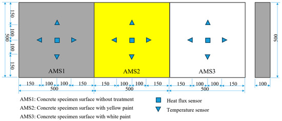 Absorptivity is the ratio of the thermal radiation energy absorbed by an object to the total thermal radiation energy incident on the object, which could directly affect the temperature field distribution inside the concrete structure. The surface absorptivity can be calculated by using the principles of heat transfer and energy balance to establish a heat balance equation on the surface of the specimen [42]. A surface absorptivity measurement experiment was designed to measure the absorptivity of the yellow and white paint and their respective surfaces on the concrete specimen. The absorptivity measurement specimen (AMS) is depicted in Figure 3. Three concrete specimens with dimensions of 500 × 500 × 100 mm3 (AMS1, AMS2, and AMS3) were fabricated for the experiment. AMS1, AMS2, and AMS3 represent concrete specimen surfaces without treatment, concrete specimen surfaces with yellow paint, and concrete specimen surfaces with white paint, respectively. And the concrete is standard C40 concrete, and the paints are consistent with that used in emissivity measurement experiment. A heat flux sensor (XM269C, greenteg AG, Rümlang ZH, Switzerland, parameters shown in Table 2) and four temperature sensors (PT100, Hangzhou Guizhong Technology Co., Ltd, Hangzhou, China, parameters shown in Table 3) were affixed to the surface of each specimen. These sensors were utilized to measure the heat flux at the center of each specimen and the temperatures in four directions on the surface of the specimen. Then, 1.35 kg/m2 of yellow paint was applied to AMS2, and white paint was applied to AMS3.