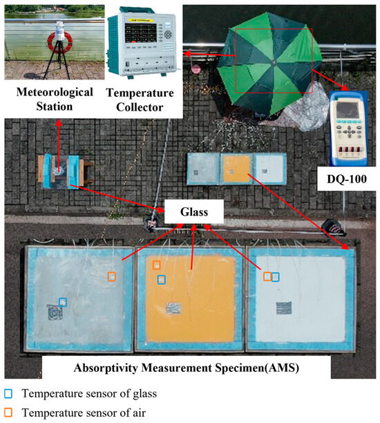 Figure 4 shows the instruments and experimental setup for the absorption measurement of AMS. After transporting the AMS to the corresponding outdoor positions, a 5 mm thick glass cover was placed on its surface to prevent convective heat exchange between the AMS and the ambient atmosphere. A temperature sensor was installed in the gap between the glass plate and the specimen to measure the air temperature in the gap (the orange frame in Figure 4, in Equation (3), Section 2.3.1), and another temperature sensor was attached to the inner surface of the glass to measure the surface temperature of the glass (the blue frame in Figure 4, in Equation (4), Section 2.3.1). To collect real-time weather data, a portable weather station (FT-BQX7, Shandong Fengtu Internet of Things Technology Co., Ltd., Weifang, China, see Table 4) was set up near the specimens to collect meteorological conditions. The sampling frequency was set to 15 min, collecting information such as solar radiation ( in Equation (2), Section 2.3.1). A similar glass plate was placed above the weather station to avoid discrepancies in the data compared to the specimens. Utilizing the heat flux sensor (XM269C, parameters as shown in Table 2) to measure the magnitude of heat flux ( in Equation (5), Section 2.3.1) passing through the specimen surface, measurements were conducted using a heat flux data acquisition instrument (DQ-100, Yi’an (Shanghai) Electronic Technology Co., Ltd., Shanghai, China), with data collected every minute. The temperature sensors (PT100, parameters as shown in Table 3) were connected to a multi-channel data logger (TP700, Shenzhen Topray Electronic Co., Ltd., Shenzhen, China, parameters as shown in Table 5) for collecting the temperature of each specimen surface ( in Equation (4) and in Equation (3)), the glass plate, and the air gap between the glass plate and the specimen, with data collected every minute. All data were collected during a period around noon when the sun was nearly perpendicular to the test site. Data from time periods with relatively stable solar radiation were selected for calculating the absorptivity, with detailed methods provided in Section 2.3.1.