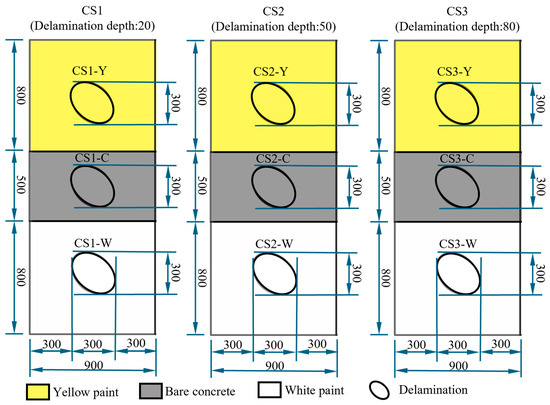 As shown in Figure 5, three concrete specimens (CS1, CS2, and CS3), measuring 2100 mm × 900 mm × 100 mm, were designed for the delamination detection experiment under natural environmental conditions. The specimens were cast using the same specification of concrete as in the absorptivity measurement experiment. CS1, CS2, and CS3 represent concrete specimens with foam simulators’ depths of 20 mm, 50 mm, and 80 mm, respectively. Inside each specimen, three foam simulators of delamination were embedded. These delaminations were elliptical in shape and identical in size, each enclosed within a 300 mm × 300 mm square, with a thickness of 10 mm. Each delamination was numbered, with C, Y, and W representing concrete, yellow paint, and white paint surfaces, respectively, and 1, 2, and 3 indicating delamination depths of 20 mm, 50 mm, and 80 mm. For example, CS1-C represents a delamination located 20 mm beneath the concrete surface. It is worth noting that the thermal conductivity of polystyrene foam is k = 0.027 W/(m·°C), which is similar to air, k = 0.024 W/(m·°C) [9]. For the concrete surface, white and yellow paints were brushed on both sides of the specimens at a rate of 1.35 m2/kg, aimed at altering the surface properties of the concrete (such as emissivity and absorptivity). The paint used was the same type as that used in the aforementioned experiments. Each color of paint covered an area of 900 × 800 mm2, leaving the middle section as bare concrete, with an area of 900 × 500 mm2 (Figure 5). To reduce heat conduction in both directions, thermal insulation boards were installed around the specimens to prevent heat exchange between the concrete specimens (except for the surface and bottom) and the environment.