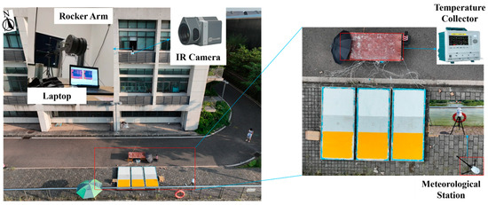 Figure 6 illustrates the setup of equipment and the experimental site. In this experiment, solar radiation was utilized as the thermal excitation method for detection research. According to the American Society for Testing and Materials (ASTM-D4788) recommendation, the specimens were pre-exposed to sunlight for a minimum of 4 h before data collection commenced. The data collection equipment for meteorological data, temperature sensor data, and infrared images are described in Section 2.2.1 and Section 2.2.2. Additionally, data were continuously collected over multiple day–night cycles to avoid the occurrence of incidental phenomena.
