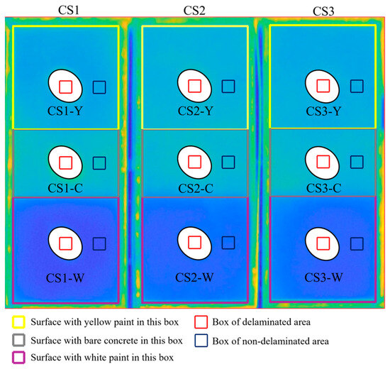 In the equation, , , and represent the average surface temperatures of the delaminated area (red box in Figure 7), non-delaminated area (blue box in Figure 7), and the temperature difference between the delaminated and non-delaminated areas, respectively. The areas within the yellow, gray, and purple rectangles represent regions of the concrete specimen coated with yellow paint, bare concrete, and coated with white paint, respectively. These average temperatures are extracted from the infrared images. When ΔT > 0, it indicates that Td > Tnd, meaning the temperature in the delaminated area is higher than that in the non-delaminated area (referred to as the “heat island” area); conversely, if the temperature in the delaminated area is lower than that in the non-delaminated area (referred to as the “cold island” area), ΔT < 0.