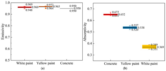 The emissivity was obtained using Equation (1) from Section 2.3.1. Figure 8a shows the box plot of emissivity for different materials, where the short lines on the top and bottom of the boxes represent the maximum and minimum values in the data set. The solid black line represents the mean value of the data. The mean emissivity value for each material falls within the box, and the variances are nearly 0, 0.00003, and 0.00004, respectively. The emissivity values for yellow paint and white paint were found to be 0.960 and 0.965, respectively. The emissivity of concrete, based on relevant studies [45], was taken as 0.950. The absorptivity was obtained using Equation (2) from Section 2.3.1. The average values were then derived from these calculations. Figure 8b shows the box plot of absorptivity for different materials, where the short lines on the top and bottom of the boxes represent the maximum and minimum values in the data set. The solid black line represents the mean value of the data. The mean absorptivity value for each material falls within the box, and the variances are nearly 0, 0.00008, 0.00014, and 0.00022, respectively. The absorptivity values for bare concrete, yellow paint, and white paint were found to be 0.652, 0.538, and 0.369, respectively. According to relevant studies [46], the absorptivity of normal concrete ranges from 0.57 to 0.66, yellow concrete ranges from 0.52 to 0.58, and white concrete ranges from 0.31 to 0.40, which are comparable to the measurement of this study.