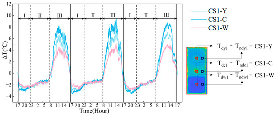 Zone III represents a period of rapid temperature changes within the concrete specimen after the appearance of radiation (approximately from 7:00 to 17:00). During this period, the three ΔT curves experience sharp increases, intense oscillations, and rapid declines. There are distinct gradients during the intense oscillations, and the maximum ΔT values are approximately 9 °C (CS1-C), 7 °C (CS1-Y), and 5 °C (CS1-W), respectively.