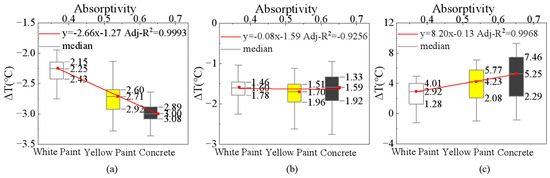 The relationship between ΔT and absorptivity (concrete, yellow paint, and white paint are 0.652, 0.538, and 0.369, respectively): (a) Zone I; (b) Zone II; and (c) Zone III.