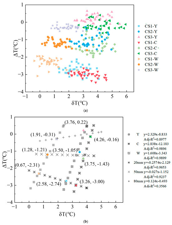 Figure 11a shows the plot depicting the temperature difference between the non-delaminated area and the air (δT) and thermal contrast (ΔT) in Zone I. In the figure, the scatter points of δT with respect to ΔT for each delamination form a coherent group based on depths and surface conditions. Therefore, the k-means clustering method [47] was applied to process the delamination data of different surface materials and depths in Figure 11a, where k is set as 1. Here, k represents the centroids of each delamination data cluster, the data sets’ central positions, as shown in Figure 11b, and the points with the same color and shape as in Figure 11a.