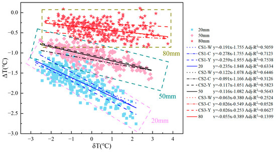 As shown in Table 6, the variance analysis [48] was conducted on ΔT with the same depth and different surface treatment methods, and their correlation coefficients p were all less than 0.05, indicating a significant correlation between data with the same depth but different absorptivities. Under the same depth, the mean values (20 mm: −1.77, −1.65, −1.66; 50 mm: −1.04, −1.20, −1.02; 80 mm: −0.27, −0.58, −0.38) and median values (20 mm: −1.70, −1.59, −1.60; 50 mm: −1.04, −1.19, −0.99; 80 mm: −0.27, −0.58, −0.37) are relatively close, which further confirms their strong correlation. Indeed, the scatter plots for each surface material are very close, and except for the 80 mm delamination, ΔT increases with increasing δT. The results show that during this period, ΔT is unrelated to surface absorptivity but is related to depth and surface emissivity. This finding indicates that when depth and δT are determined, the range of ΔT can be determined.