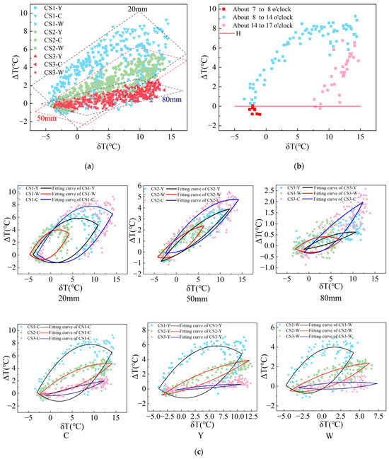 As shown in Figure 13, the plot depicts the temperature difference between the non-delaminated areas and the air (δT) and thermal contrast (ΔT) in Zone Ⅲ. When the sun appears, the ambient temperature gradually rises. Although the temperature of the specimen also gradually increases, when the specimen’s temperature is higher than the ambient temperature, the specimen radiates energy to the outside. This results in different ΔT values at the same δT, forming a behavior similar to a hysteresis curve. It was observed that the scatter plot resembles a hysteresis model. By using the hysteresis model, the relevant hysteresis curves were fitted accordingly [50]. The hysteresis curve rises rapidly to its maximum value at the same depth. Then, it slowly decreases to a specific value before rapidly dropping to its minimum value. It finally returns slowly to the origin, as shown in the upper half of Figure 13c. The degree of expansion of the hysteresis curve increases with the absorption rate, with the curves for the 20 mm deep delamination particularly noticeable. For instance, the ΔT for CS1-C rapidly rises from 0 °C to around 8 °C, then decreases to about 6.5 °C before sharply dropping to around −1.5 °C and finally returning to the origin. Similarly, the ΔT for CS1-Y quickly climbs from 0 °C to about 5 °C, decreases to around 4 °C, then drops to around −1 °C, and returns to the origin. For CS1-W, the ΔT rises swiftly from 0 °C to approximately 3.5 °C, then decreases to about 3 °C, drops to around −0.5 °C, and finally returns to the origin. This phenomenon could be because surfaces with higher absorption rates have a greater ability to absorb solar radiation, accumulating more heat. Additionally, due to the restriction of heat transfer in the delaminated areas, the temperature in the delaminated regions tends to be higher than that in the non-delaminated regions.
