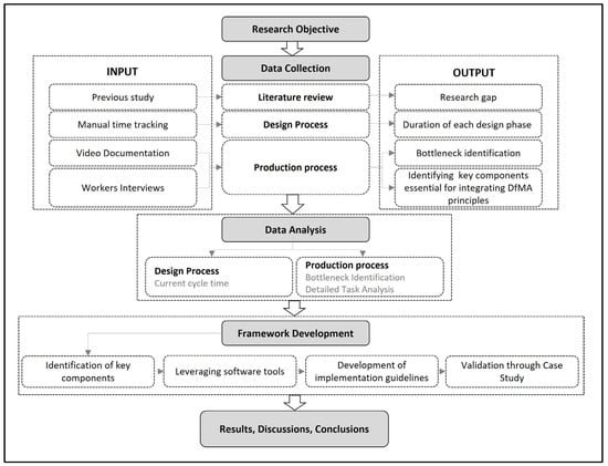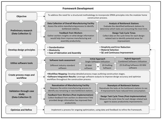 To achieve the research objective, we started by collecting data, which included a literature review, data collection on the design process, and documentation of the production process. Key data were collected in collaboration with our industry partner, the modular home factory. The collected data were then analyzed to identify the current cycle time, bottlenecks, and key components necessary for integrating DfMA principles. A framework development phase was conducted after data analysis, in which different software tools that help implement DfMA principles were assessed, key components were identified by interviewing factory workers, and then the software tools were integrated into the modular home factory framework; finally, the framework was validated. During the final stage, the results, discussions, and conclusions of the research were synthesized.