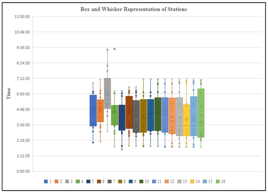 Based on video recordings from three months across the factory, the production process analysis shows the cycle time distribution across various stations in a modular home factory using a box-and-whisker plot. The cameras were installed at different stations to monitor the start and end times of activities, allowing for precise tracking of events with real-time timestamps. There was one shift starting at 6:00 a.m. and ending at 4:30 p.m., with workers operating Monday to Thursday, taking two 15 min breaks and a 1 h lunch. This data were compiled into an Excel sheet to generate the plot, which is illustrated in Figure 2.
