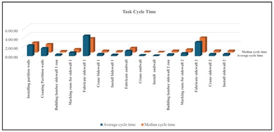 Data collection for the production process was conducted in two steps: First, comprehensive data collection through video recordings of the entire manufacturing facility was conducted to evaluate the cycle times of each station within the production process. The term “station” refers to the 16 positions in the production line through which the modular home passes. The results of the video recordings identified bottlenecks in the factory. Following this, a detailed task analysis was conducted using the video data to document the total time workers spent on each task within the bottleneck stations. This provided a deeper understanding of the tasks contributing to the bottleneck and facilitated the development of targeted interventions to improve efficiency and streamline production processes.