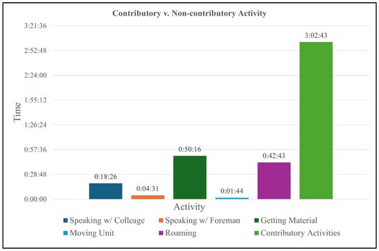 In addition, after creating a table listing all tasks out of the video recordings, we filtered them by identifying non-contributory tasks, then generated a chart to visualize time spent on contributory versus non-contributory tasks, categorizing them into more general groups as shown in Figure 4. The majority of the time, approximately 3 h and 2 min, is spent on contributory activities, while smaller amounts of time are consumed by non-contributory activities such as roaming (42 min), obtaining material (50 min), and speaking with colleagues or the foreman. This highlights that while most time is devoted to productive tasks, there is still some inefficiency due to non-contributory activities.