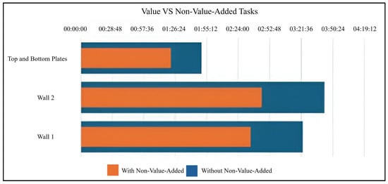 After distinguishing contributory versus non-contributory tasks in Station 3, we selected components with the longest production times—specifically, the production of top and bottom plates, Wall 1, and Wall 2. Figure 5 illustrates the value-added versus non-value-added tasks for these components and shows the potential impact of eliminating non-value-added activities.