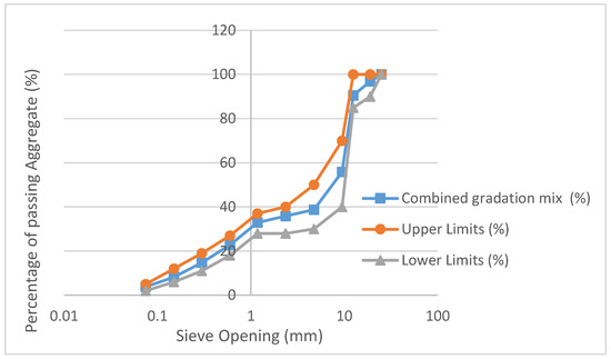The locally available natural coarse and fine aggregates used in the study were compliant with ASTM C-33 [48] and consisted of dolomite limestone and natural sand. Table 3 shows the specific gravity and water absorption for fine and coarse RAP aggregate in 25 mm maximum nominal sizes according to ASTM standard. Sieve analysis test was performed to ensure that both aggregate types were well graded as shown in Figure 1.