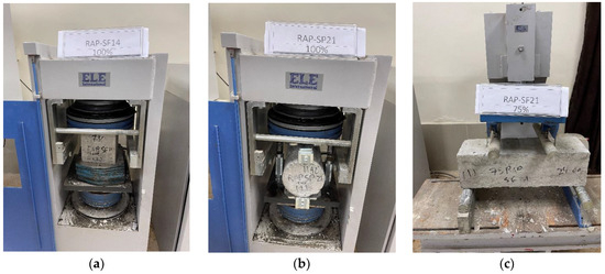 A compression test was performed according to BS EN 12390-3:2019 [62] on cubes of 150 mm × 150 mm × 150 mm. In addition, a splitting test was conducted on cylinders of 150 mm × 300 mm according to ASTM C496 [63]. Also, a flexural test was performed on prisms of 150 mm × 150 mm × 500 mm in accordance with ASTM C78 [64]. Figure 3 presents the experimental test setup.