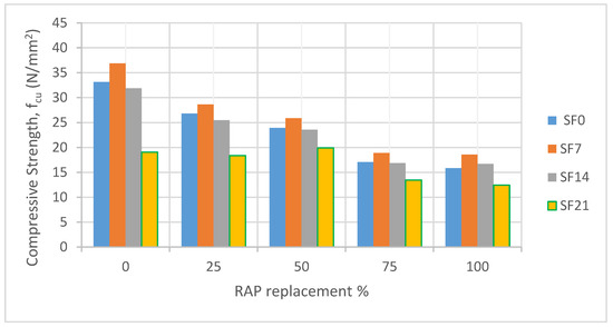 Examination of Figure 4 and Figure 5 reveals a systematic reduction in compressive strength as RAP content increases. The systematic reduction in compressive strength was observed in both SF- and SP-containing concrete across all levels of RAP replacement. The compressive strength of concrete decreased from 33.17 N/mm2 (100% natural aggregate [NA]) to 15.86 N/mm2 (100% recycled aggregate [RAP]), which is 48% (Table 9). When using 25% RAP, the compressive strength was 81% of the strength with 0% RAP. Other studies showed that the reduction in compressive strength varied from 50% to 75% for 50% and 100% RAP, respectively, for coarse and fine aggregate replacement and the effect of fine aggregate replacement has a more negative impact on compressive strength than coarse aggregate replacement. They also found that the compressive strength depends on the treatment process applied to RAP (cleaned or left uncleaned) before mixing [65,66].