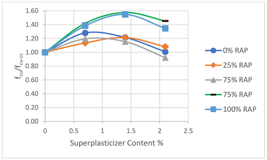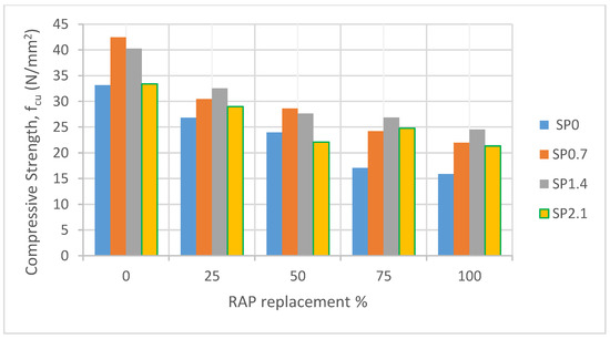Compressive strength with different RAP replacement for concrete containing superplasticizer.