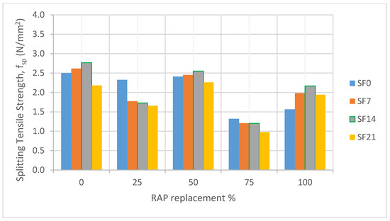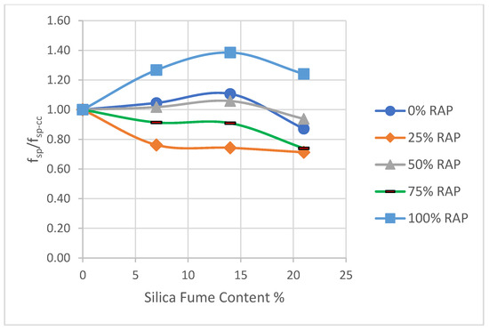 Splitting tensile strength with different RAP replacement for concrete containing silica fume.