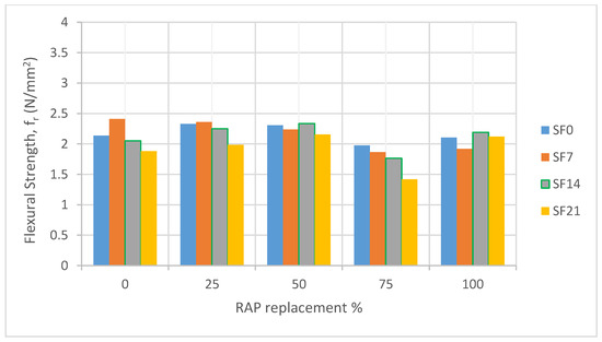 Unlike with the compressive and splitting tensile strengths, a slight increase in flexural strength was observed for most RAP replacement ratios, as shown in Figure 8 and Figure 9. However, an exception was observed at 75% RAP. These results align with studies that indicate lower to moderate RAP replacement ratios can enhance flexural strength due to the interlocking effect of the RAP particles. Also, the viscoelastic properties of the asphalt binder might act more cohesively within the matrix, aiding in stress distribution and improving toughness during flexural loading [25,29,42,68]. Compared to compressive strength results, the flexural strength of concrete containing low percentages of RAP increased because the rough surface texture of RAP improved bonding with the cement paste, enhancing stress distribution and crack resistance. In contrast, compressive strength uniformly decreased with higher RAP content due to the lower stiffness and strength of RAP compared to natural aggregates, which increased porosity and weakened the overall matrix structure [67,71].