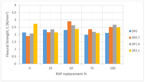 Figure 4, Figure 5, Figure 6, Figure 7, Figure 8 and Figure 9 show the effects of the RAP replacement on compressive strength, splitting tensile strength, flexural strength with silica fume SF and superplasticizer SP, respectively. Generally, strengths reduced with the inclusion of RAP, as shown in the figures, which agree with other research results as mentioned earlier in the literature review [25,26,27,28,29,42]. This can be attributed to the weak bonding between the asphalt film and the concrete aggregate. The asphalt coat around the aggregate particles typically forms a film with a thickness between 6 and 9 µm [42]. The weak bond of the asphalt film caused premature failure. Additionally, the presence of micro-cracks caused by crushing and the previous use of the RAP aggregate contributed to its reduced strength compared to natural aggregate.