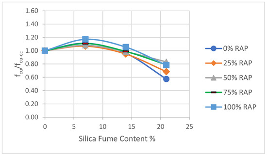 The best fit equations for the curves were obtained to find the optimal strength (fcumax) and the corresponding optimum SF content for each RAP series, as shown in Table 10. From the table, the compressive strength increase varied from 8% to 17%. The highest increase in compressive strength was 17% when the RAP content was 100%. Also, the range of optimal SF content varied from 5.86% to 7.10% (see Table 10). From previous studies on recycled aggregate concrete, the compressive strength increase varied from 15% to 20% and the range of optimum SF dosage was between 5% and 10% [51,52,53].
