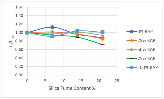 Figure 10, Figure 11 and Figure 12 illustrate normalized (unitless) curves for the test results of compressive strength, splitting tensile strength, and flexural strength, respectively, with different dosages of SF. The figures present the strength values as a ratio from the control concrete strength (0% SF) for each RAP replacement series. Presenting the curve in this manner facilitates the comparison and study of the optimal effect of SF. Also, optimal strength and silica fume content is shown in Table 10. The symbols fcu-cc, fsp-cc and fr-cc denote the compressive strength, tensile splitting strength, and flexural strength, respectively, for the control concrete.