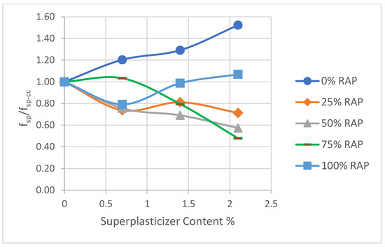 Studies indicated that SF can accelerate early hydration and enhance bond strength, while SP ensures better distribution and flowability. When appropriately dosed, their synergy improves the mechanical performance of RAP concrete, balancing workability with strength gains [46]. Optimizing the ratios of SF and/or SP is key to maximizing these benefits. However, the superplasticizer content in the study was not a direct focus.