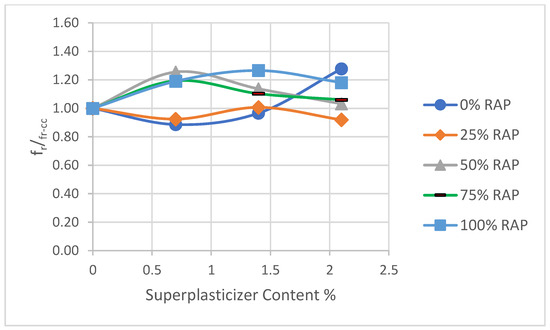 Table 9 shows a summary for the test results for control concretes (see Table 7a) with a different RAP replacement. The symbols of fcu-cc, fsp-cc and fr-cc are the compressive strength, tensile splitting strength, and flexural strength, respectively, for concrete without agents (SF = 0 or SP = 0). The symbols of fcu-cc0, fsp-cc0 and fr-cc0 are the compressive strength, tensile splitting strength, and flexural strength, respectively, for the control concrete (CC) without RAP or agents. The data presented in Table 9 are limited to the control concretes to isolate the impact of RAP replacement on strength. The effects of silica fume (SF) and superplasticizer (SP) on strength will be discussed in subsequent sections.